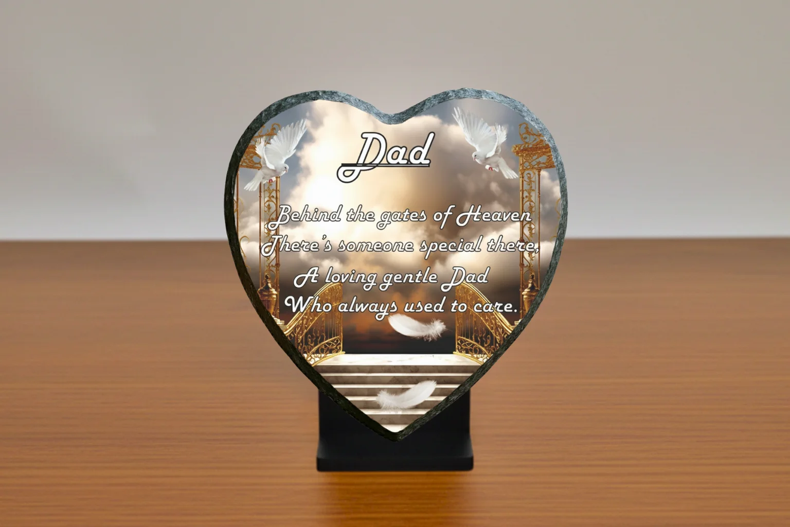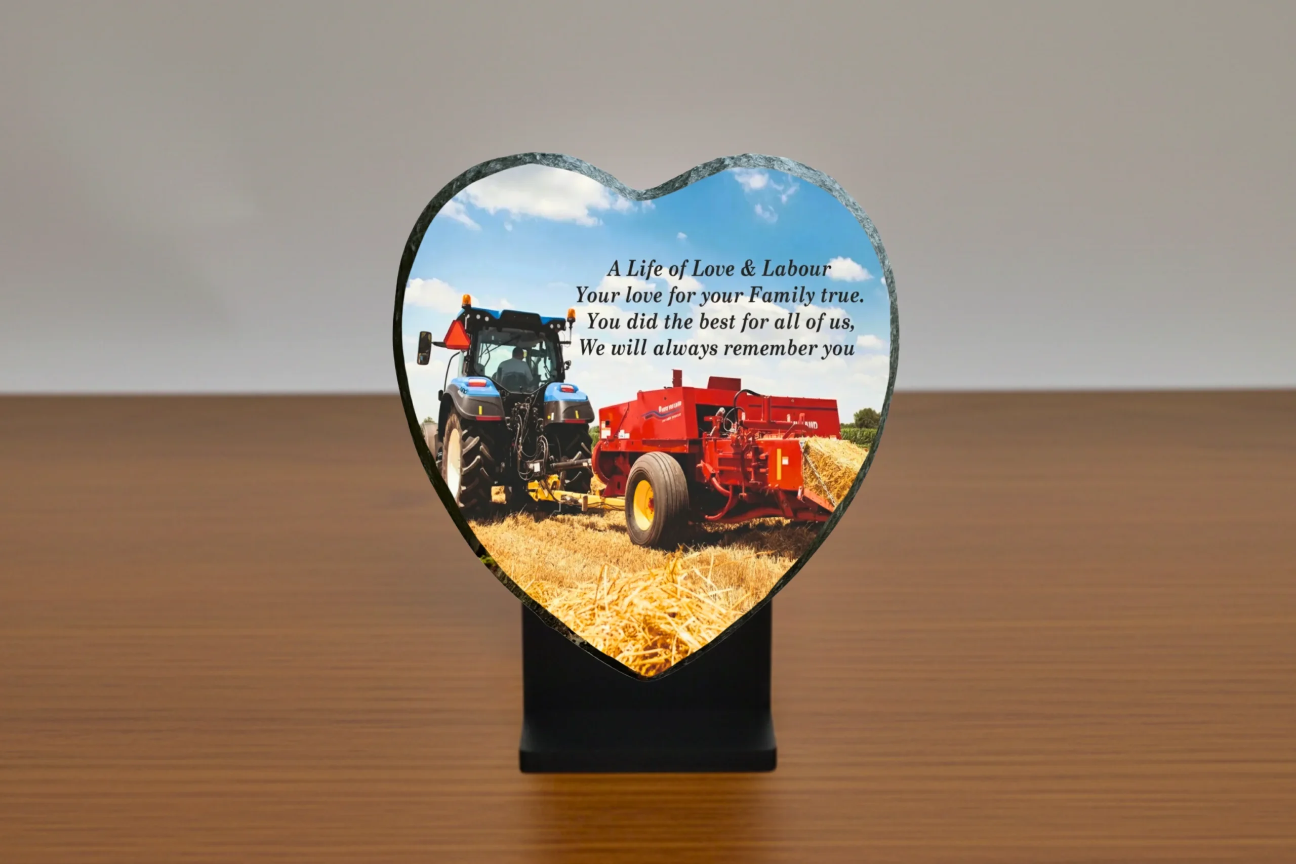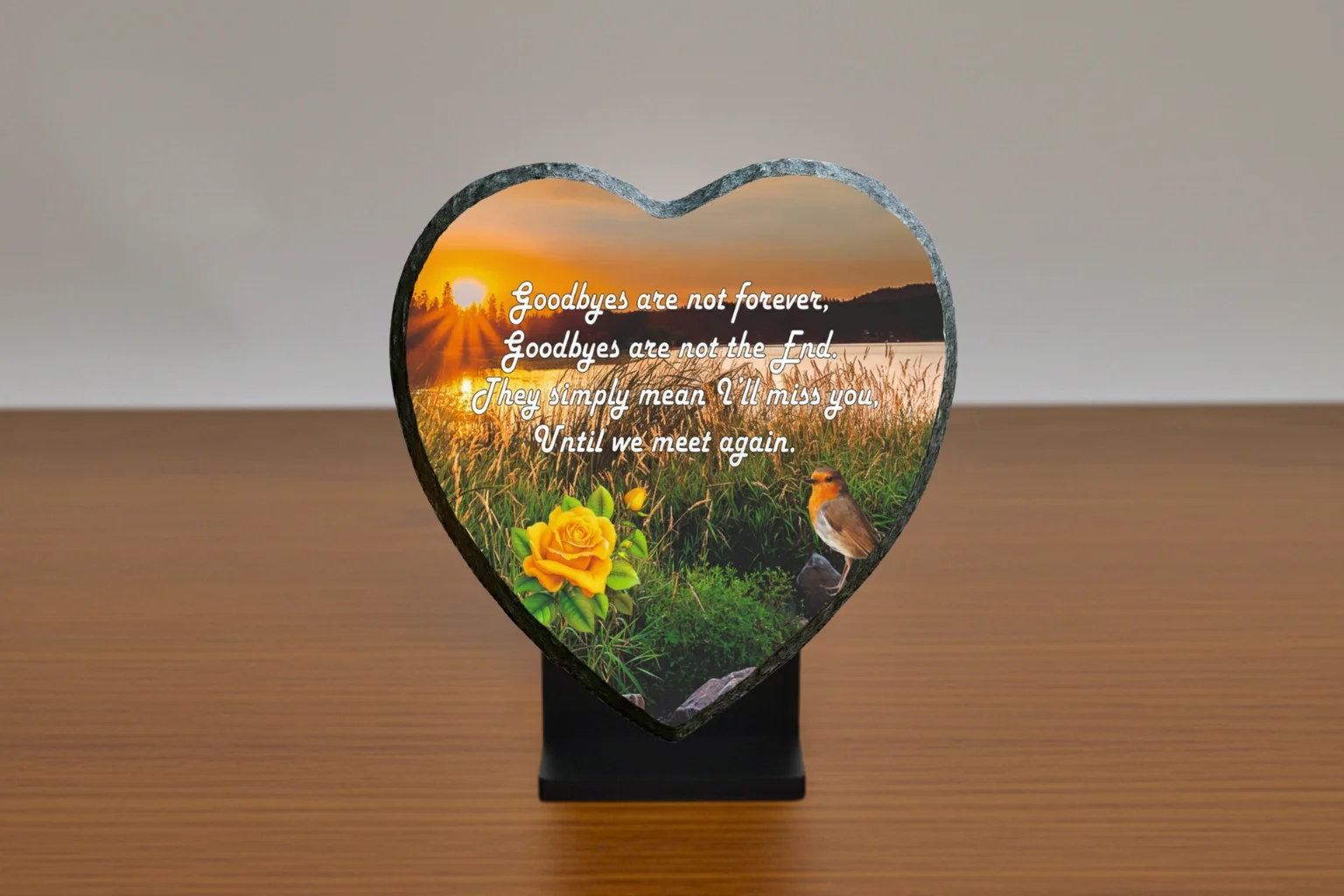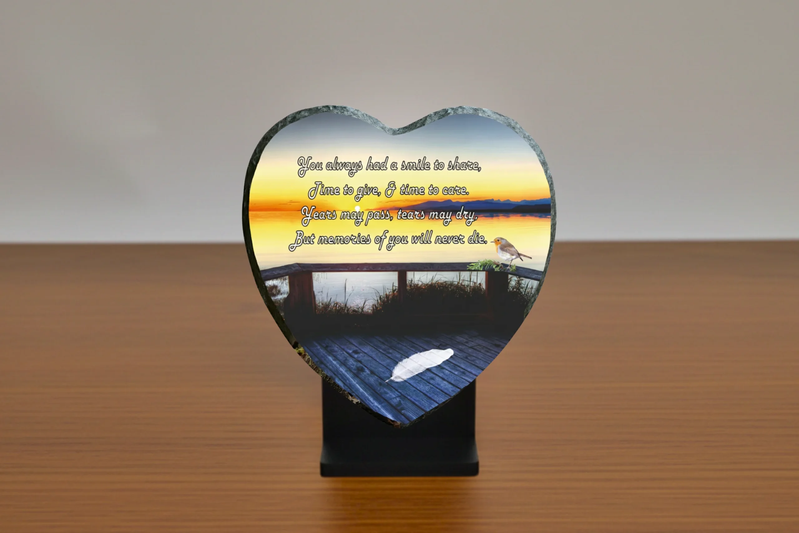 Our memorial plaques are made from real slate with a natural stone uneven texture edge. Slight variations in the size of slate and natural imperfections or pits in the surface, which may be visible in the final print, all give each slate its own distinct and unique features.