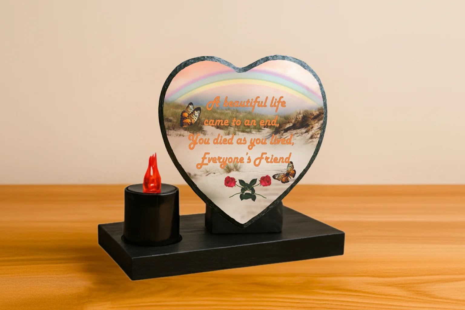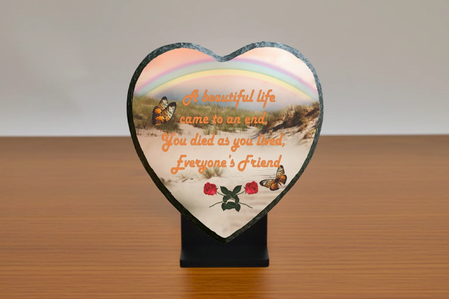 All our Plaques are mounted on a Recycled plastic base, making our product more environmentally friendly and ensuring stability when placed on a loved one’s resting place. Because slate naturally attracts heat and rays from the sun, fading will occur. To help delay this process, all our plaques are UV-coated, prolonging their life against these natural weather conditions.