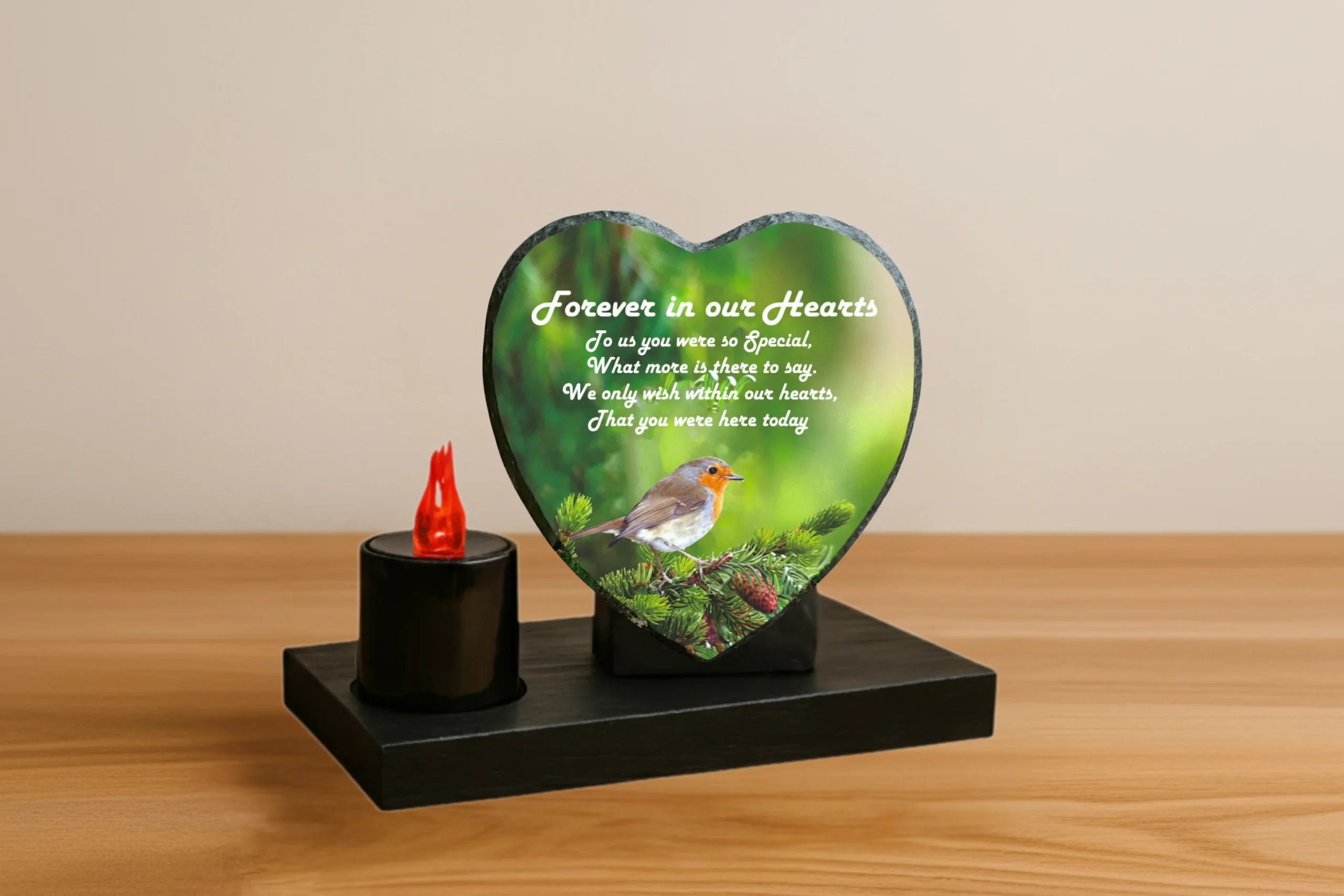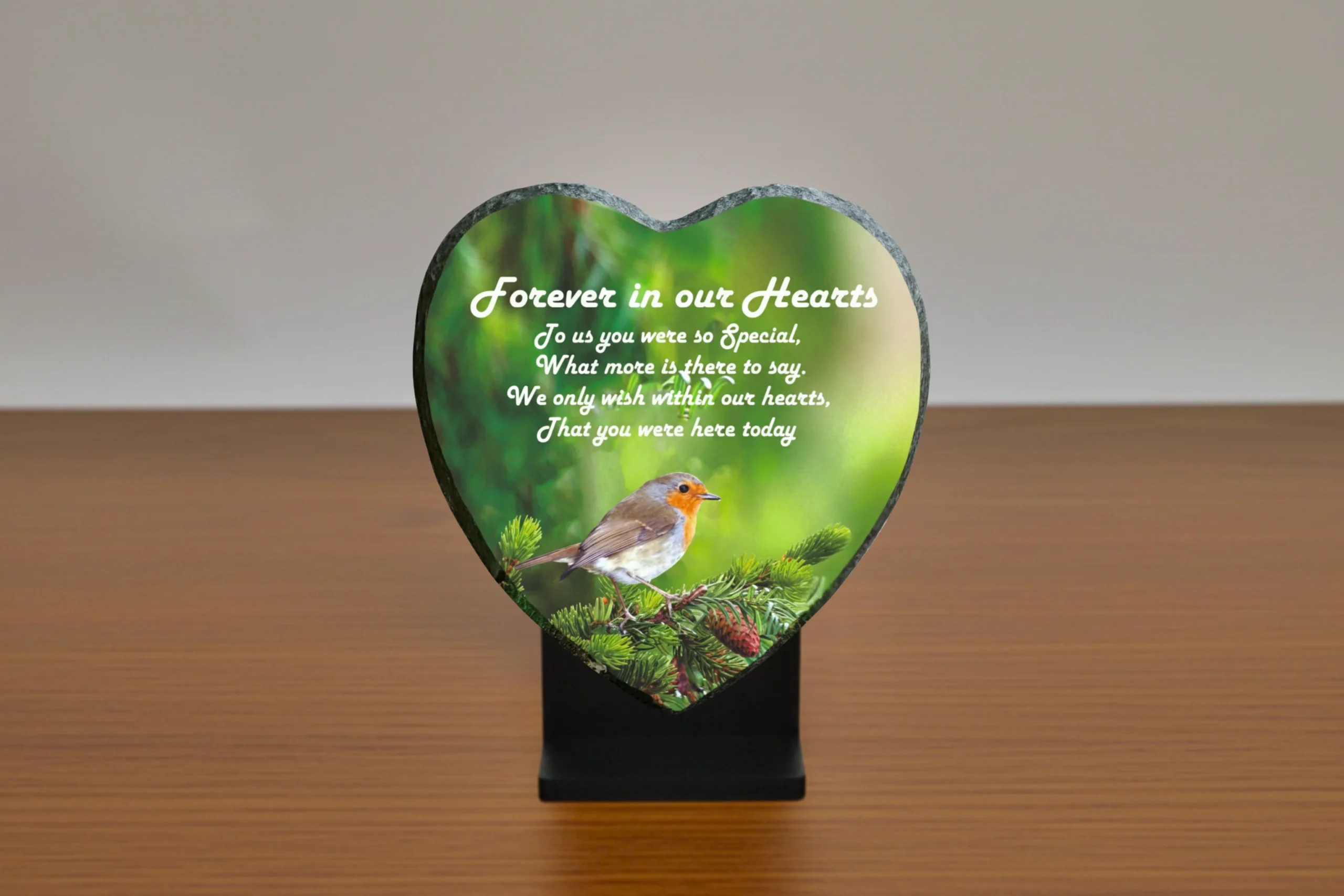 Our memorial plaques are made from real slate with a natural stone uneven texture edge. Slight variations in the size of slate and natural imperfections or pits in the surface, which may be visible in the final print, all give each slate its own distinct and unique features.