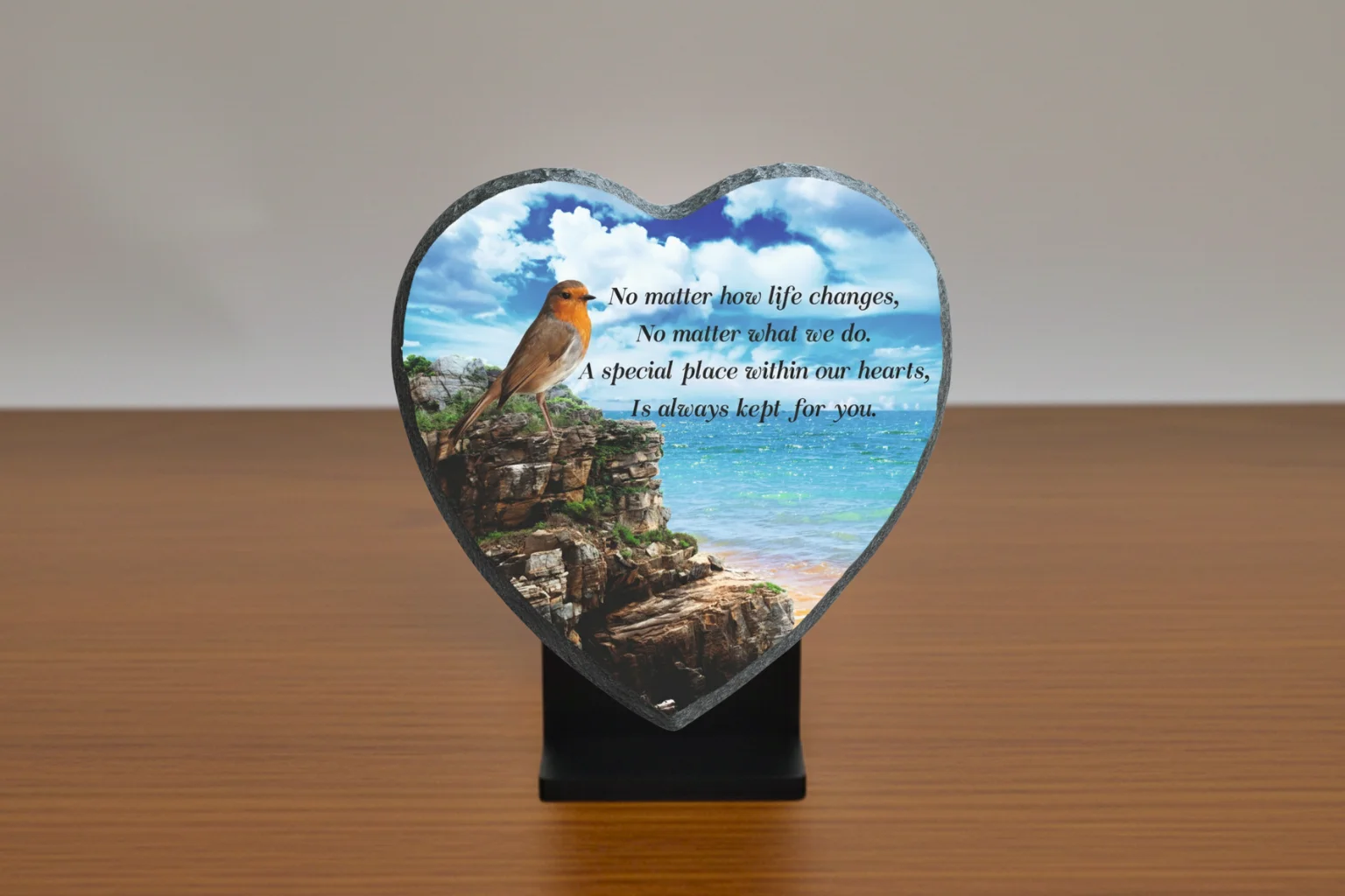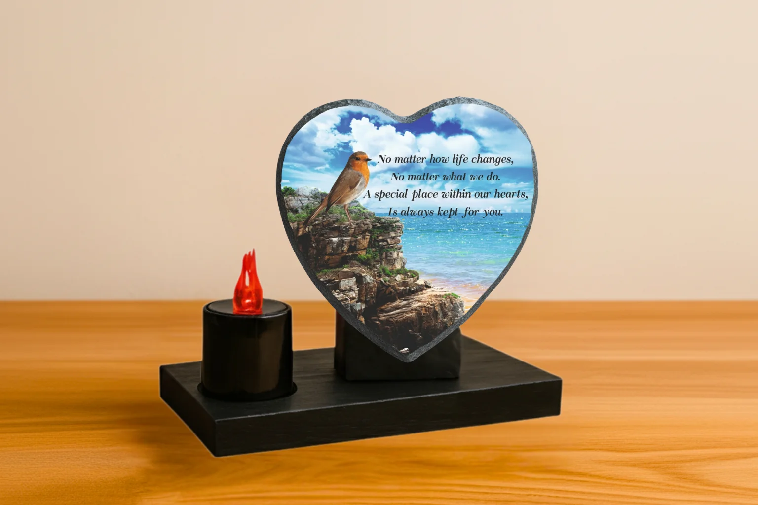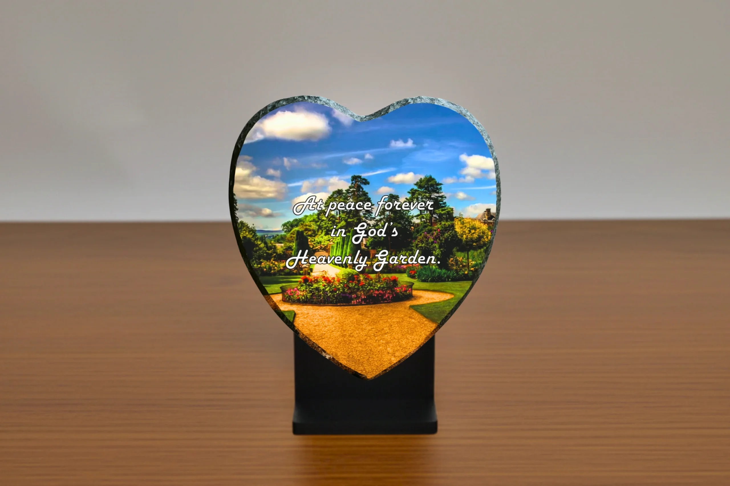 Our memorial plaques are made from real slate with a natural stone uneven texture edge. Slight variations in the size of slate and natural imperfections or pits in the surface, which may be visible in the final print, all give each slate its own distinct and unique features.