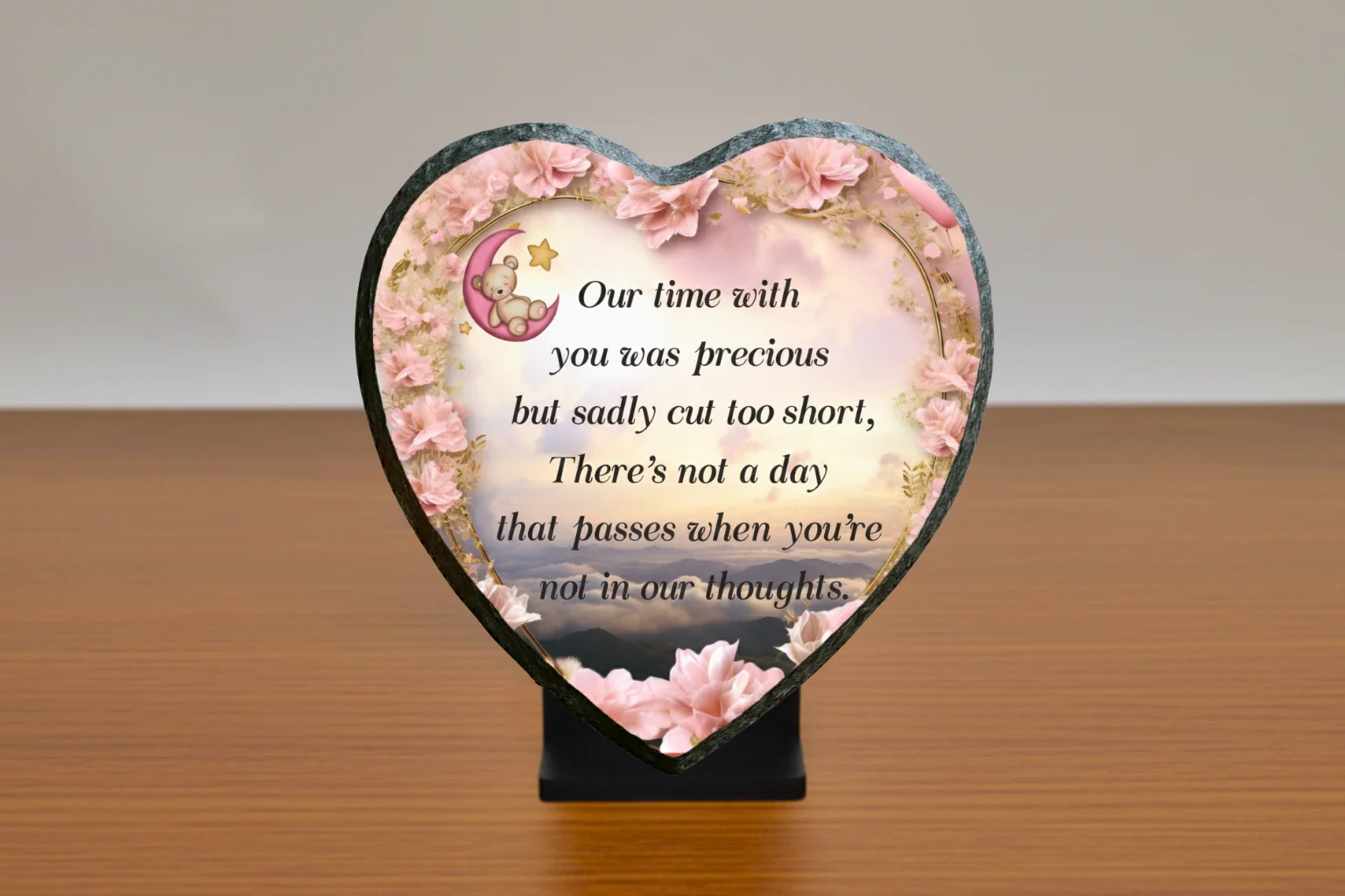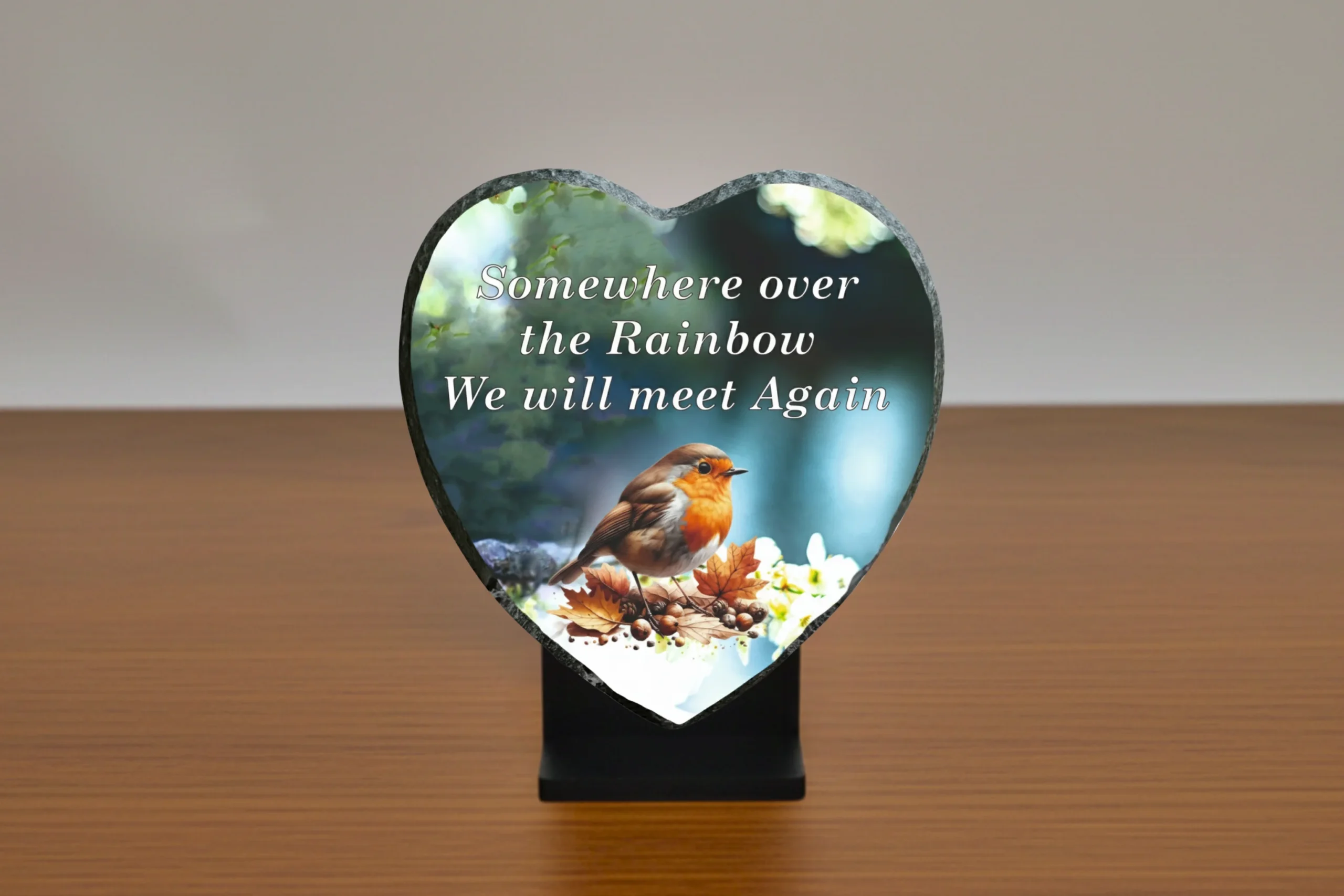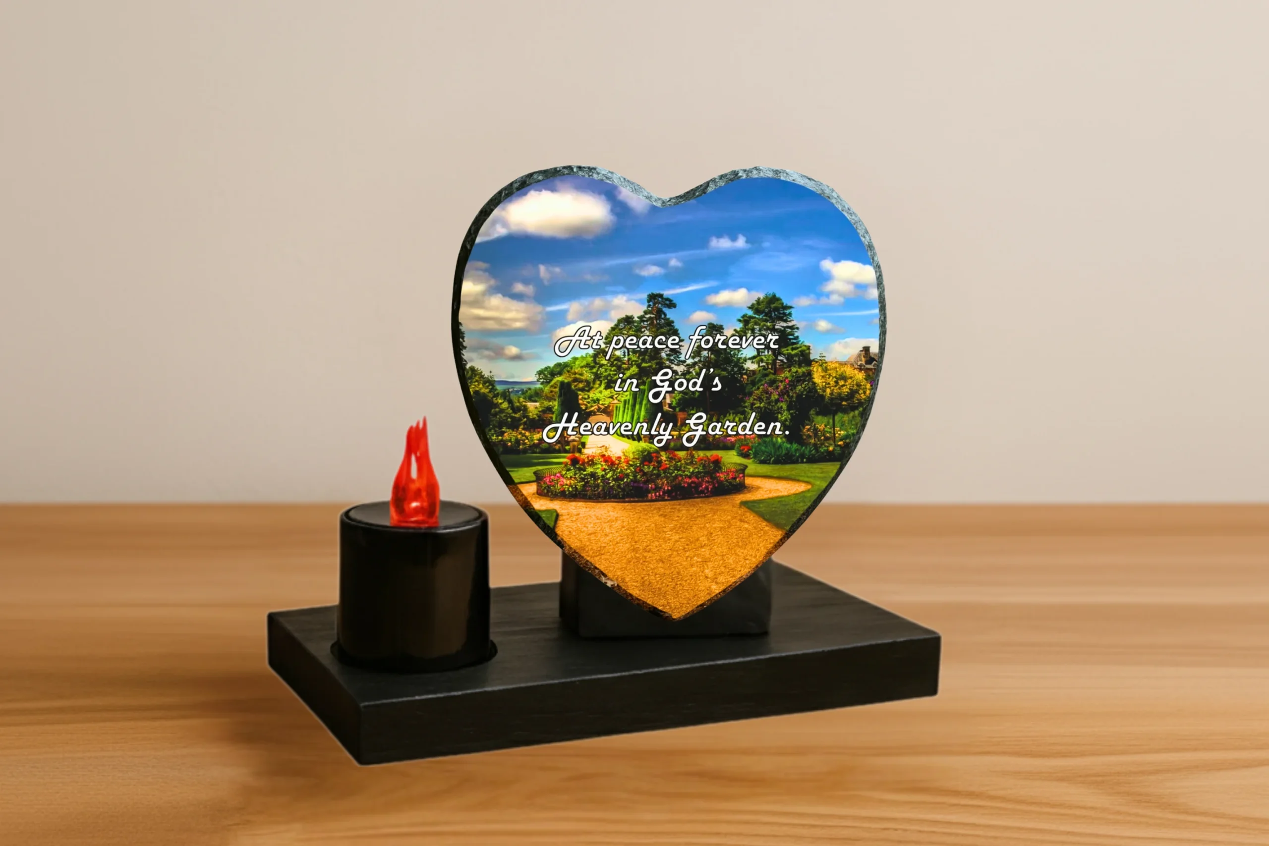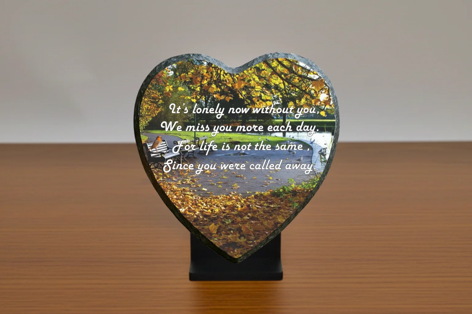 Our memorial plaques are made from real slate with a natural stone uneven texture edge. Slight variations in the size of slate and natural imperfections or pits in the surface, which may be visible in the final print, all give each slate its own distinct and unique features.