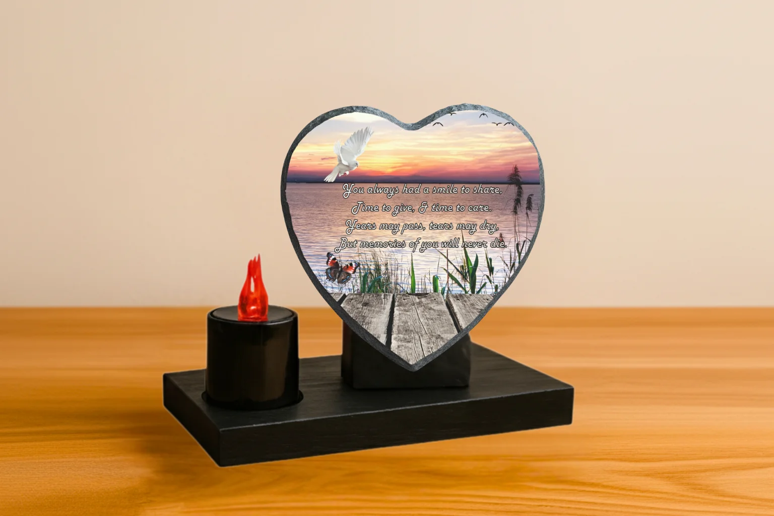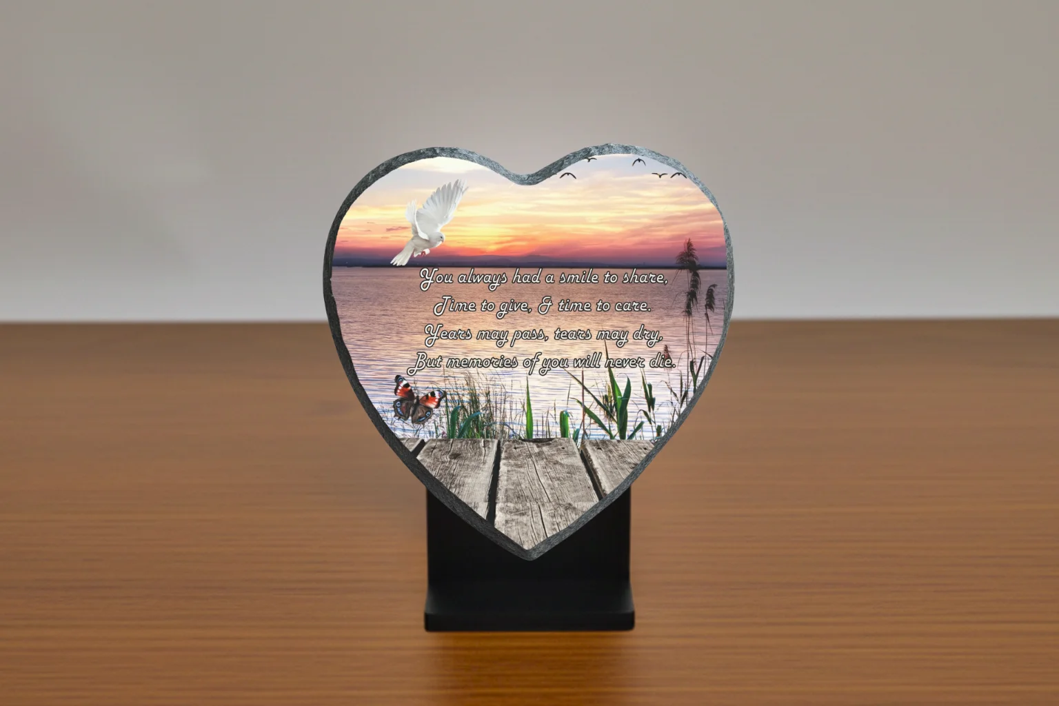 All our Plaques are mounted on a Recycled plastic base, making our product more environmentally friendly and ensuring stability when placed on a loved one’s resting place. Because slate naturally attracts heat and rays from the sun, fading will occur. To help delay this process, all our plaques are UV-coated, prolonging their life against these natural weather conditions.