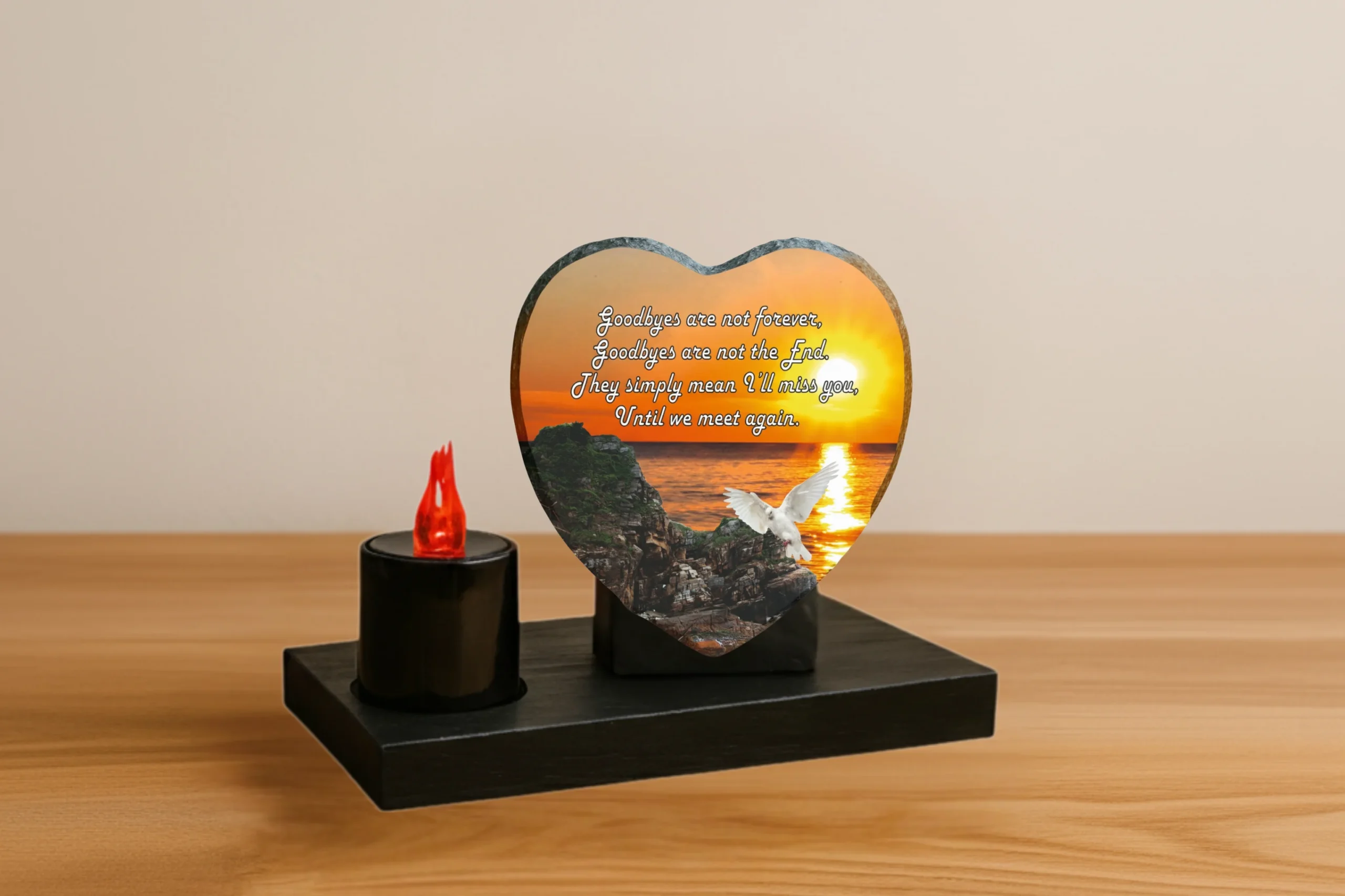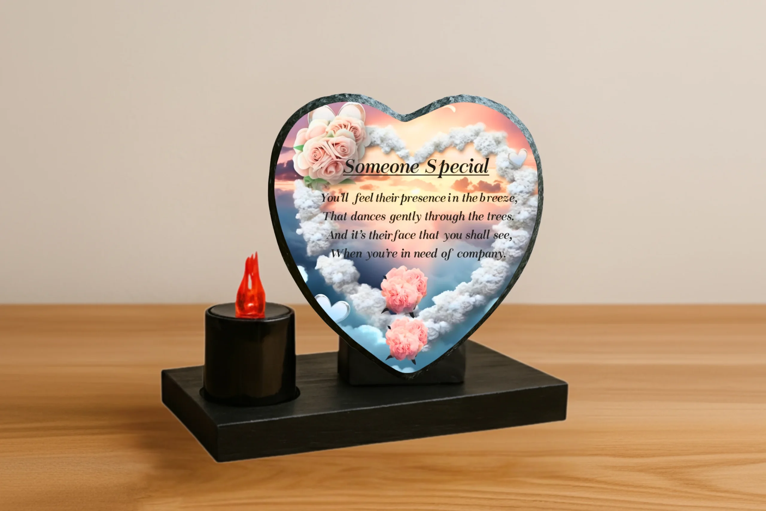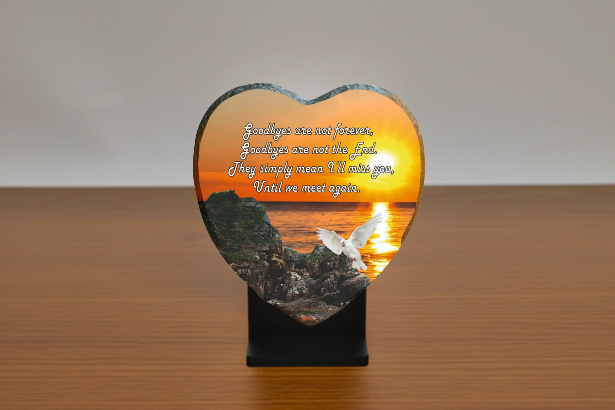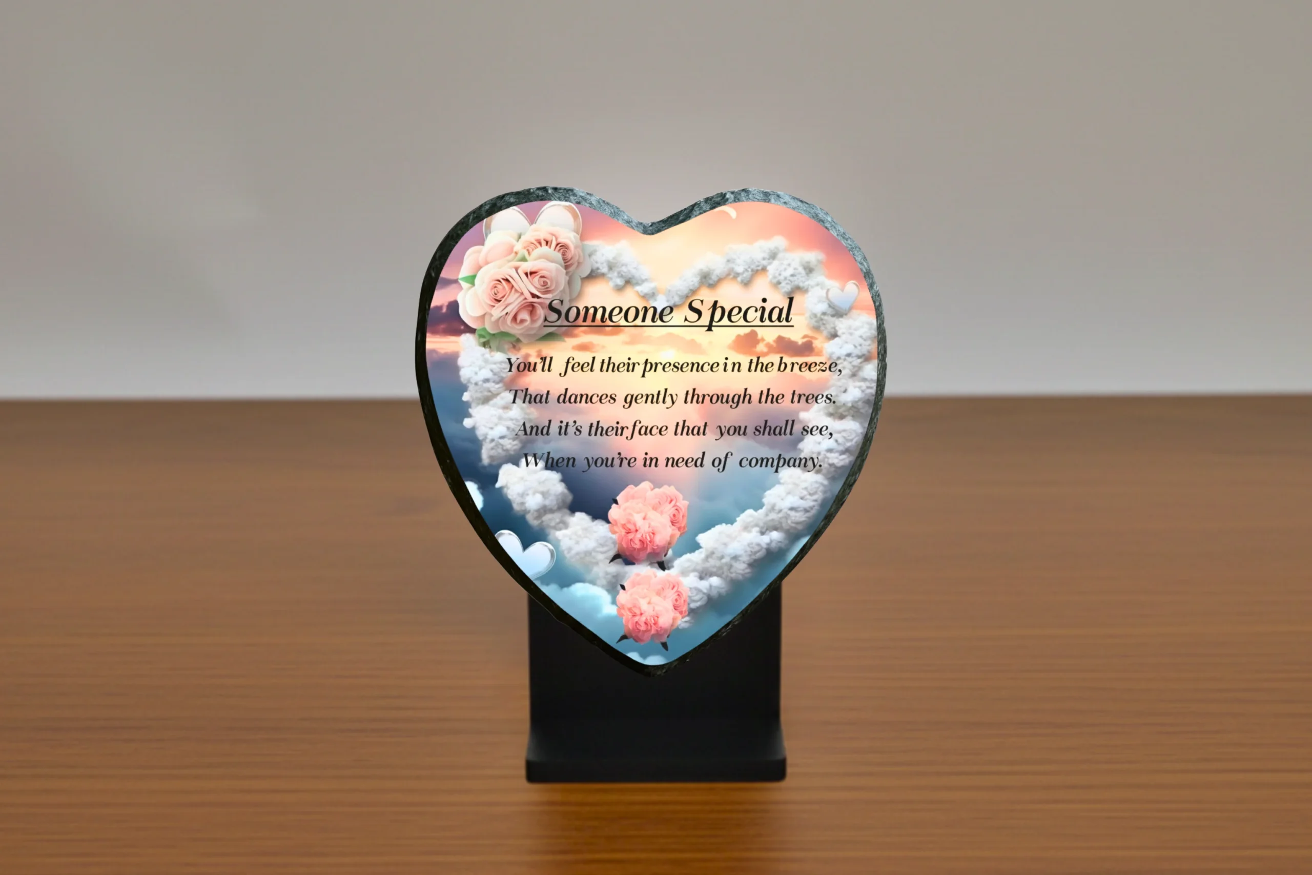 Our memorial plaques are made from real slate with a natural stone uneven texture edge. Slight variations in the size of slate and natural imperfections or pits in the surface, which may be visible in the final print, all give each slate its own distinct and unique features.