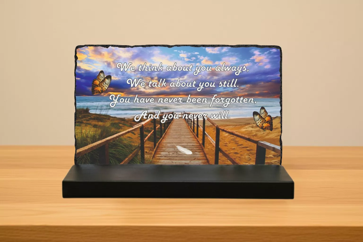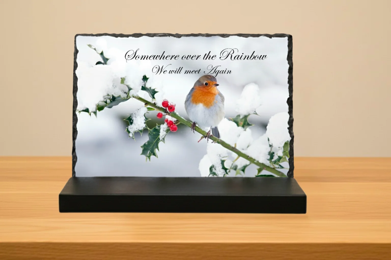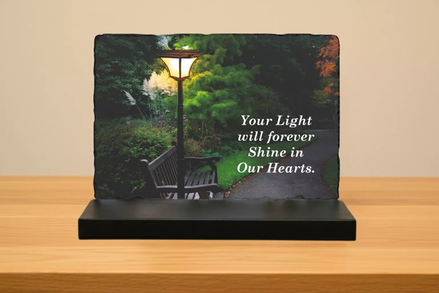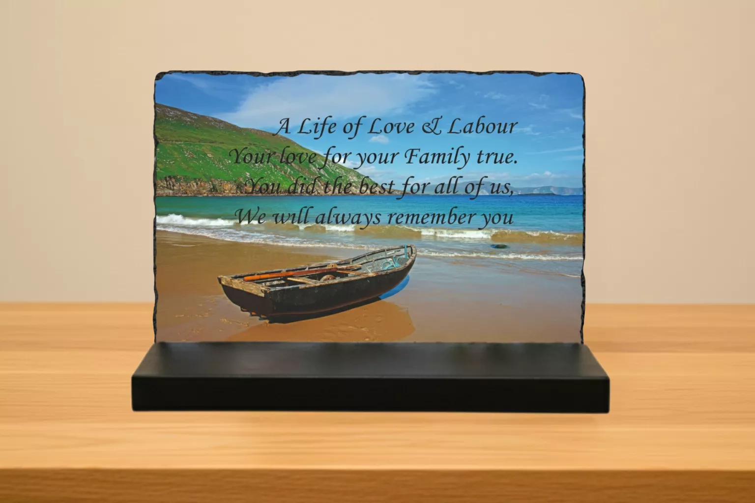 Our memorial plaques are made from real slate with a natural stone uneven texture edge. Slight variations in the size of slate and natural imperfections or pits in the surface, which may be visible in the final print, all give each slate its own distinct and unique features.