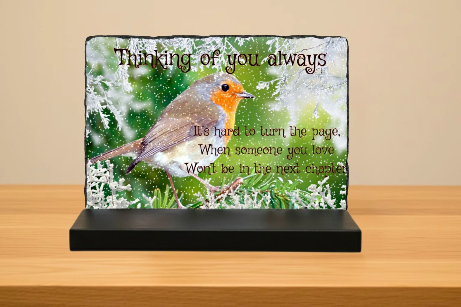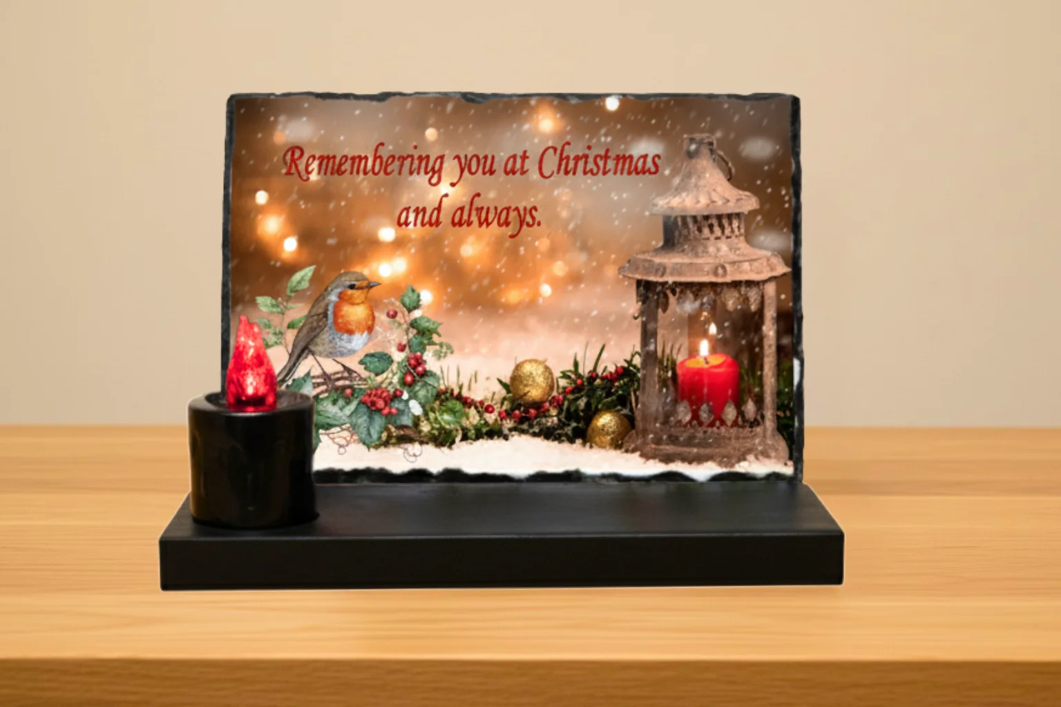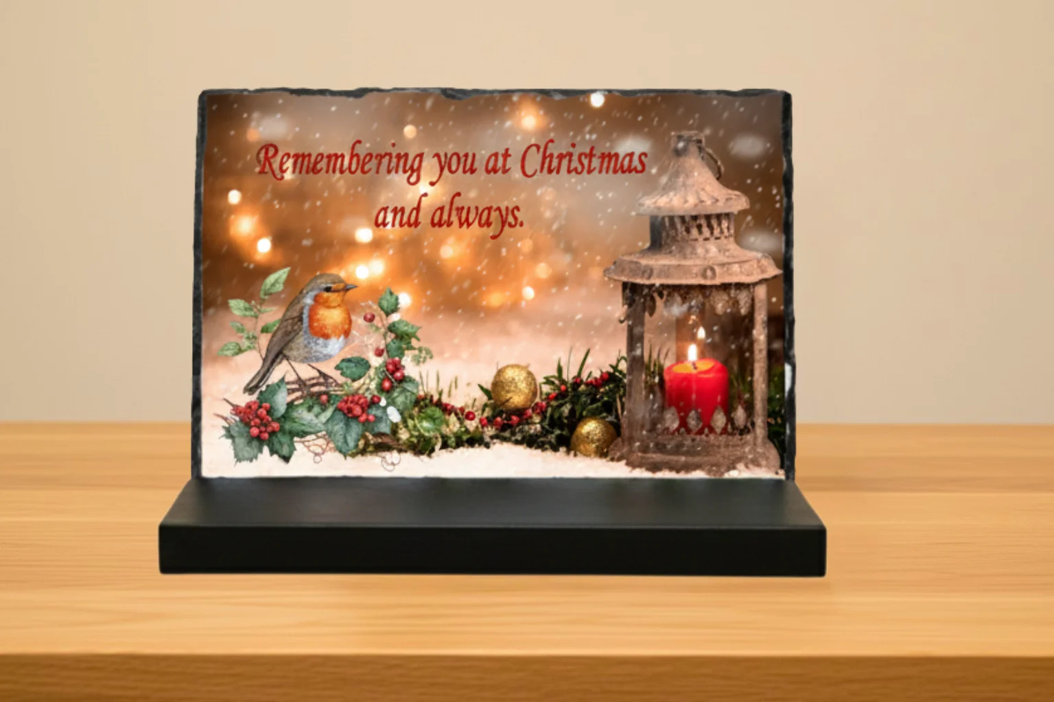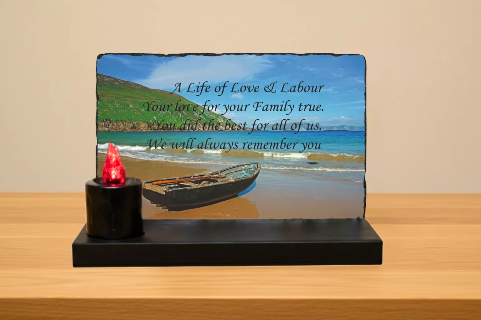 Our memorial plaques are made from real slate with a natural stone uneven texture edge. Slight variations in the size of slate and natural imperfections or pits in the surface, which may be visible in the final print, all give each slate its own distinct and unique features.
