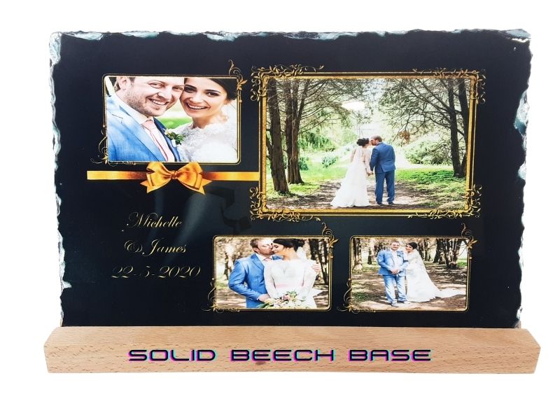 A beautiful collage of Wedding Day photographs on a natural slate mounted on a sturdy solid beech wooden base. Preserving forever the memories of your special day. (Please provide high Res photos in Landscape mode if possible)